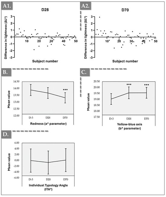 Clinical monitoring results using the Chromameter device. (A1,A2) ∆L * parameter (lightness) distribution evolution per patient between 28 days and 70 days of follow-up. (B) a * parameter (redness) evolution. (C) b * parameter (yellow–blue axis) evolution. (D) ITA° parameter (Individual Typology Angle) evolution. Error bars = 95% confidence interval. Statistical significance (i.e., p-value ≤ 0.001) was evidenced by three asterisks (***). Detailed statistical analysis results are reported in Tables S5 and S6.