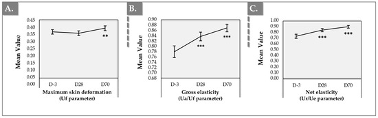 Clinical monitoring results using the Cutometer device. (A) “Uf” parameter (maximum skin deformation) evolution. (B) “Ua/Uf” parameter (gross elasticity) evolution. (C) “Ur/Ue” parameter (net elasticity) evolution. Error bars = 95% confidence interval. Statistical significance was evidenced by two asterisks (i.e., “**” for p-value ≤ 0.01) or by three asterisks (i.e., “***” for p-value ≤ 0.001). Detailed statistical analysis results are reported in Table S7.