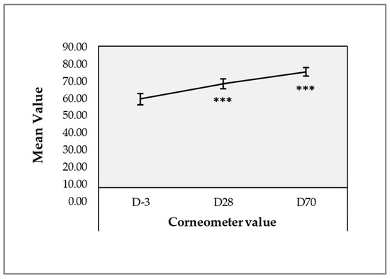 Clinical monitoring results using the Corneometer device. Error bars = 95% confidence interval. Statistical significance (i.e., p-value ≤ 0.001) was evidenced by three asterisks (***). Detailed statistical analysis results are reported in Table S7.