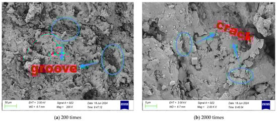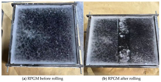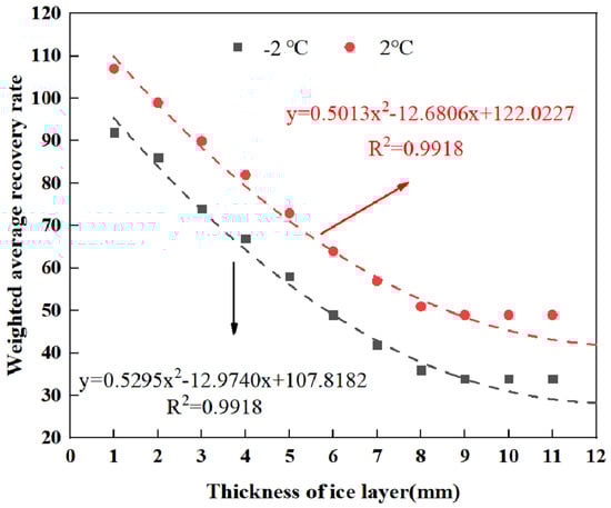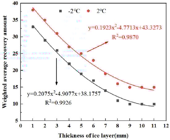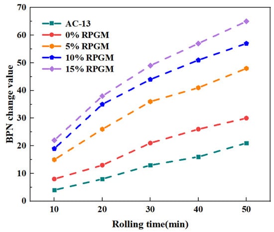 - Compared with the traditional asphalt mixture, RPGM shows superior de-icing performance, and with an increase in rubber particle content, its ice-breaking effect is significantly improved. Compared with the AC-13 asphalt mixture, the BPN change values of polyurethane gel mixtures with different rubber particle contents increased by 0.6 times, 1.8 times, 2.4 times and 2.8 times, respectively, under the rolling time of 30 min. The BPN change values of 5%, 10% and 15% RPGMs increased by 71.4%, 109.5% and 133.3%, respectively, compared with those of polyurethane gel mixtures without rubber particles. The average weighted recovery of the ice thickness to the pendulum value and the average weighted recovery rate of the pendulum value decrease with an increase in ice thickness, especially when the ice thickness is 1–6 mm. When the ice thickness reaches 9 mm, the two tend to be stable, indicating that the ice-breaking ability of the RPGM is significantly weakened. Under the action of traffic load, the RPGM can make the ice layer gradually fall off through stress, thermal effect and interface damage, indicating that RPGM exhibits strong potential for field application, subject to further long-term durability verification in real-world conditions. The ice layer damage is characterized by a mixed fracture mode dominated by a type II fracture.