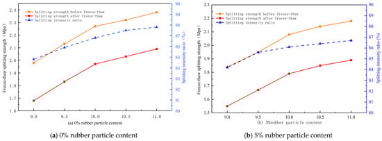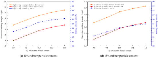 - The freeze–thaw splitting strength of the mixture with four kinds of rubber particles increased greatly when the amount of polyurethane gel reached 10%. Under the condition of fixed rubber particle content, the growth trend of freeze–thaw splitting strength of the specimen increases first and then slows down with the increase in polyurethane gel content. When the content of rubber particles is 10%, the splitting strength ratio increases by 1.1%, 1.4%, 0.5% and 0.3%, respectively, when the content of polyurethane gels increases from 9–11%. When the content of polyurethane gels is 10%, its water damage resistance can meet the requirements of use, and the optimum polyurethane gel content of the mixture is determined to be 10%.