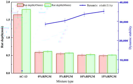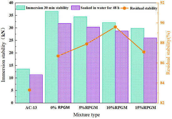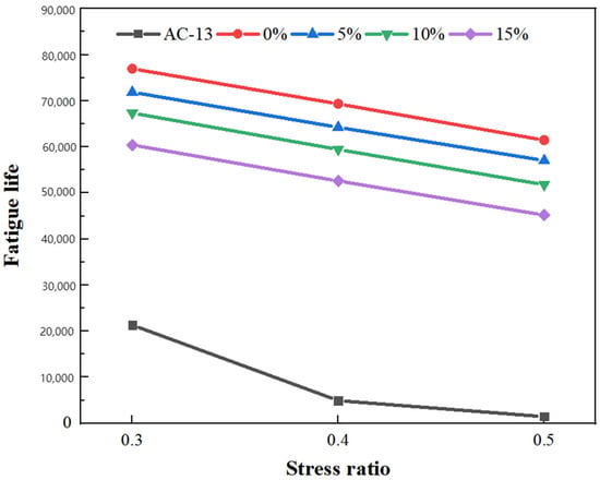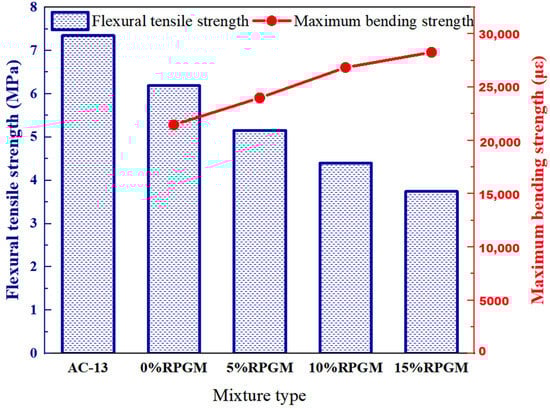- With an increase in rubber particle content, the dynamic stability of the polyurethane gel mixture shows a trend of gradual increase, which is 6.2%, 18.2% and 23.5% higher than that of undoped rubber particles, respectively, and much higher than that of asphalt mixture, indicating that its anti-rutting performance is significantly enhanced. Compared with the mixture without rubber particles, the maximum bending strain increased by 11.8%, 25.1% and 31.7%, respectively, showing excellent deformation ability. The residual stability increased first and then decreased with the increase in rubber particle content, and the residual stability increased by 1.4%, 3.3% and 0.5%, respectively. The anti-scattering performance increased with the increase in rubber content, and an excessive amount would lead to an increase in scattering loss rate, but it could still be maintained below 5%, indicating that it still had good water stability under immersion conditions. Compared with the AC-13 asphalt mixture, the fatigue life of four kinds of rubber particle content mixtures increased by 2.9 times, 3.8 times, 4.3 times and 4.0 times, respectively. The fatigue performance of the polyurethane gel mixture decreased with an increase in rubber particle content. Compared with the ordinary asphalt mixture, the friction coefficient of four kinds of rubber particle content increased by 14.7%, 16.1%, 19.1% and 22.3%, respectively, which further verified its excellent skid resistance.