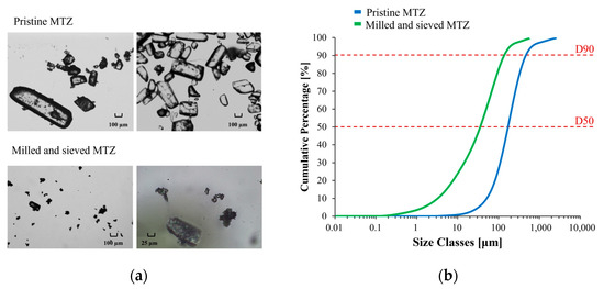 The <180 μm fraction was selected. The particle size distribution of MTZ was assessed (Mastersizer 3000, Malvern Panalytical, Worcestershire, UK) before and after the milling process. Images of pristine and processed MTZ were acquired using an optical microscope (5× and 20× magnification, Olympus BX 60, Olympus Global, Tokyo, Japan).
