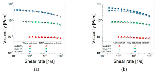 In steady state shear tests of ALG solutions, prepared either using distilled water or a saturate MTZ solution (Figure 2a), raising the ALG concentration resulted in an increase in the zero-shear viscosity value, , and lowered the shear rate level at which the shear thinning behavior can be observed. This latter effect was especially noted for solutions containing 4% and 6% ALG. Instead, a quasi-Newtonian behavior was observed for 2% ALG solution.