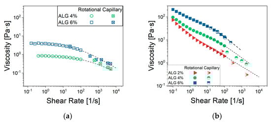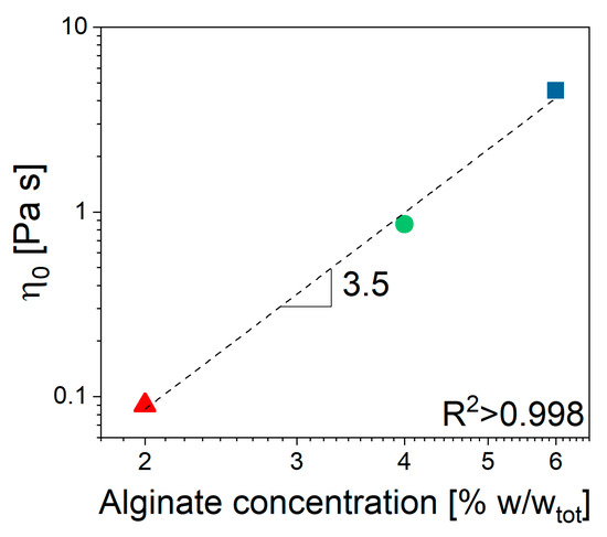 Furthermore, there was no significant interaction between ALG and the selected drug, despite the ionic nature of both species (Figure 2a), as the viscosity seemed not to be affected by the presence of MTZ in solution. All viscosity data could be fitted using the Cross’ model (Equation (5)) with the parameter reported in Table 1. Despite the 2% ALG solution, the determination of the m and l parameters is quite uncertain, given its quasi-Newtonian behavior. The most significant effect of ALG concentration, CALG, consisted of an increase in (Figure 3) according to Equation (1):