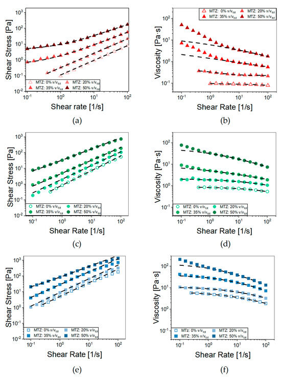 Flow curves of (a) NA_A, (c) NA_B, and (e) NA_C containing increasing volumetric fractions of MTZ powder (0–50%). Dashed lines represent the fitting with the Herschel–Bulkley model (Equation (6)). Viscosity curves of (b) NA_A, (d) NA_B, and (f) NA_C containing increasing amounts of MTZ powder (0–50%); dashed lines represent their fitting with the Cross’ Model (Equation (5)). Each data point represents the average of at least 5 tests. For the sake of readability, standard deviations are omitted.