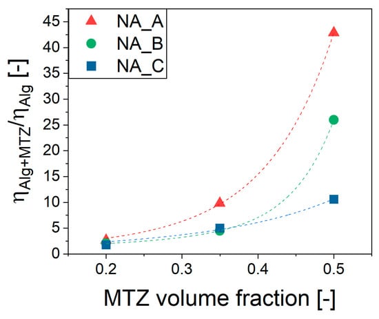 The effect of MTZ volume fraction, , on the viscosity of NA_suspensions was apparent from Figure 5, in which an increase of over 40 times the viscosity of unfilled precursor solution was observed for the 2% ALG. The effect was lower, but still very important for the 4% ALG and 6% ALG solution.