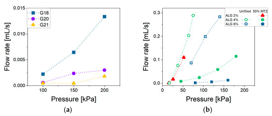 Flow rate vs. pressure for (a) NA_C.50 extruded through G18, G20, G21 nozzles and (b) NA_suspensions containing different MTZ amounts extruded through the G18 nozzle. Lines are intended as a visual aid. Data for the suspension containing ALG 2% are unavailable, as its low viscosity caused uncontrolled dripping from the cartridge even under atmospheric pressure.