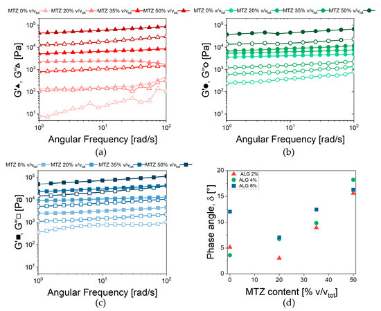 The results of frequency sweep tests in Figure 8 confirm that, after GDL addition, a hydrogel was formed for any MTZ content, as confirmed by the limited dependence on frequency and the low level of the phase shift angle. Also, the crosslinking kinetics were practically unaffected by the filler: the gel point was reached after about 30 min from adding GDL, while the reaction ended after about 4 h (Figure S3).