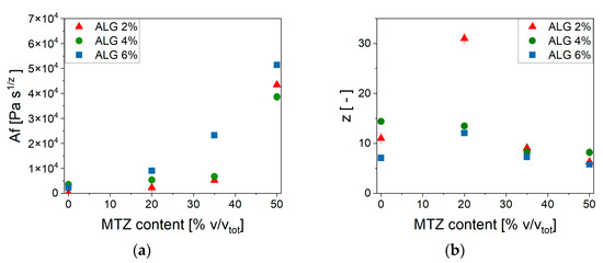 At each ALG concentration, the values of Af increased with increasing MTZ content and reached a comparable value for all ALG concentration. On the other hand, the number of interactions between alginate chains, z, was, in general, reduced at increasing MTZ volumetric fractions. In general, MTZ appeared to dominate the rheological behavior of the hydrogel by stiffening it, probably due to the inherent stiffness of the MTZ particle, but also modifying the interactions between the macromolecules forming the hydrogel. This is also associated with an increase in the dissipative behavior of the filled hydrogel, as shown by the increase in the phase angle, δ (Figure 8d), whose cause is still to be identified.