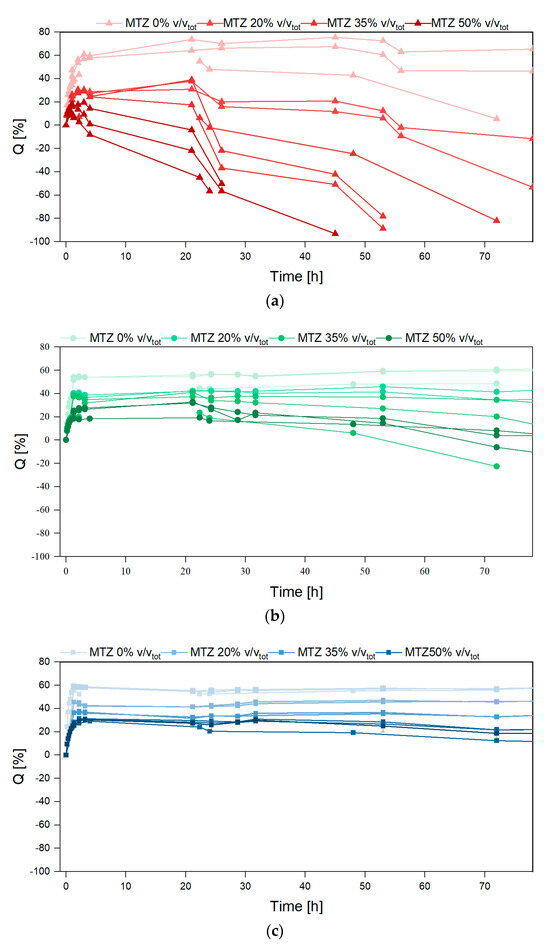Figure 10 shows a fast buffer solution uptake occurring in the first hour, causing an increase in the mass of all the investigated hydrogels. This uptake magnitude is highlighted in Figure 11, showing the effects of ALG and MTZ contents. In unfilled hydrogels, the uptake is consistent with the mesh measurement, as expected. At each ALG concentration, the swelling ability decreased with the MTZ fraction, as the hydrogel volume might be gradually occupied by drug particles, which hindered the acetate buffer entrance.