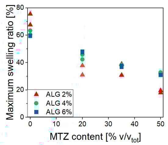 Maximum swelling ratio dependence on ALG and MTZ content.