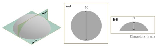 - silicon multi-portion mold with dome-shaped geometry (design shown in Figure 13) to supply samples for the swelling test. This geometry could in principle allow the estimation of both swelling and MTZ mass and volume release. The former can be obtained by mass measurement, as described below, while the latter from the optical observation of the dissolution front, exploiting the sample spherical symmetry and under the hypothesis of isotropic dissolution.
