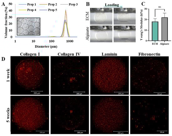 pECM microcapsule characterization. (A) Microcapsule size distribution, measured by Malvern Mastersizer 3000 for five independent preparations. (B) Mechanical analysis using a microscale tension-compression test system (applied force: 900 µN). (C) Calculated Young’s Modulus, based on the tension-compression test (n = 6). (D) Immunostaining of empty pECM microcapsules for pECM composition: collagen I, collagen IV, laminin, and fibronectin, one- and five-weeks following microcapsules preparation. Scale bars: 200 μm.