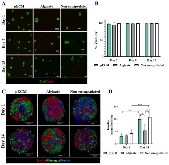 Viability and functionality of pECM-microencapsulated rat islets. (A) Fluorescent images of pECM- and alginate-encapsulated islets, and non-encapsulated islets stained with FDA (green, live cells) and PI (red, dead cells) during 15 days of culture. Scale bars: 200 μm. (B) Quantified viability results, obtained from DAPI/PI staining images and analyzed using Imaris 9.0.2 analysis software. (C) Immunofluorescence staining of insulin (red), glucagon (green), and nuclei (blue) of pECM- and alginate-encapsulated islets, and non-encapsulated islets 1- and 14-days post-encapsulation. Scale bars: 50 µm. (D) Insulin secretion upon glucose stimulation (16.7 mM-high glucose) 1- and 14-days post-encapsulation. (* p < 0.05, ** p < 0.01, *** p < 0.001, **** p < 0.0001).