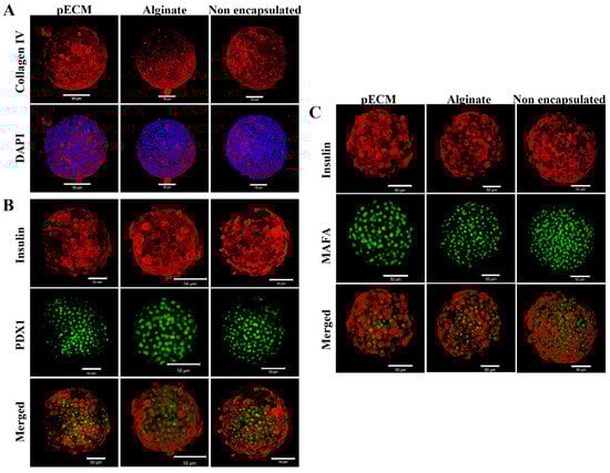 Besides evaluating islet viability and functional insulin secretion, we also studied the condition of the encapsulated islets by examining their structural integrity and the expression of functional markers. When addressing the islet structural integrity after 14 days in culture, the expression of collagen IV was observed in all three groups: pECM-encapsulated islets, alginate-encapsulated islets, and non-encapsulated islets (Figure 3A), thus indicating structural integrity preservation []. The functional markers that we addressed were PDX1 and MAFA. PDX1 is a transcription factor essential for the maintenance and survival of β-cells []. In all three groups, it can be observed that after 14 days in culture, the expression of PDX1 in the cell nuclei is co-localized with beta cells, which’s cytoplasms are stained for insulin, thus confirming that beta cells maintain the expression of PDX1 (Figure 3B). MAFA is another transcription factor necessary for adult β-cell function and the loss of its expression is considered the first indication of islet deterioration []. Figure 3C shows that after 14 days of culture, MAFA expression persists in the β-cells of the islets from all three groups.