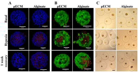 The recovery of encapsulated rat islets following hypoxia. Confocal fluorescent microscopy images of pECM- and alginate-encapsulated islets, stained with (A) DAPI (nuclei, blue), PI (apoptotic cells, red) and (B) FDA (viable cells, green), PI (apoptotic cells, red) at different time points: basal, after 24 h hypoxia, and following 1 week of recovery. (C) Bright-field images of pECM- and alginate-encapsulated islets, taken at basal condition, after 24 h hypoxia, and following 1 week of recovery. Scale bars: 200 μm.