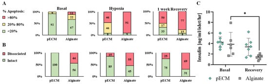 To quantify the damage caused by the hypoxic conditions, we classified the islets according to their apoptotic ratio. The islets were divided into three groups: (1) islets in poor condition with over 80 percent apoptotic cells (presented in red), (2) moderately damaged islets with apoptotic cell percentages ranging from 20 to 80 percent (presented in yellow), and (3) islets in good condition with less than 20 percent apoptotic cells (presented in green). Figure 4 reveals that some apoptotic islets were already evident under basal conditions in the alginate group. Upon induction of hypoxia, the severe damage to the islets resulted in over 90 percent of highly apoptotic islets in the alginate group and nearly 50 percent in the pECM-encapsulated islets. Following 1 week of recovery from hypoxia, however, partial recovery was observed in the alginate-encapsulated islets, with fewer islets in poor condition (77 percent) and 15 percent of moderately damaged islets. A higher recovery rate was observed in the pECM-encapsulated islets, with 33 percent of islets in good condition compared to 8 percent immediately after hypoxia (Figure 5A). To quantify the islet structural integrity following hypoxia, the islets were classified into intact or dissociated islets. Figure 5B demonstrates that at the basal time point, the alginate group already had more than 40 percent dissociated islets, compared to the pECM group, where no islet dissociation was observed. Following the induction of hypoxia, dissociation was also seen in 15 percent of the pECM group, while in the alginate group, the percentage of dissociated islets increased to 55 percent. Following one week, the percentage of dissociated islets further increased to 25 percent in the pECM-encapsulated islets and almost 70 percent in the alginate-encapsulated islets (Figure 5B). Another measure of hypoxic damage and islet recovery following hypoxia is islet functionality in terms of glucose-responsive insulin secretion. After one week of recovery, the alginate-encapsulated islets demonstrated a significant decrease in insulin secretion compared to the basal condition. In contrast, the pECM-encapsulated islets had recovered, thus secreting insulin levels that were not significantly different from the basal condition (Figure 5C and Supplementary Figure S4).