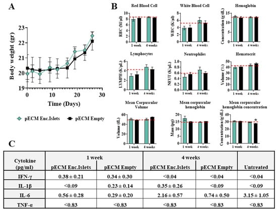 In vivo biocompatibility studies. pECM-encapsulated islets and empty pECM microcapsules were transplanted into immunocompetent mice, and the inflammatory reactions were followed. (A) Mice’s body weight measurements throughout the experiment. (B) Complete blood count at 1 and 4 weeks following microcapsule transplantation. Red dashed lines represent the mean of normal blood values for healthy, untreated mice (* p < 0.05 to the untreated group). (C) Cytokine levels in the serum 1 and 4 weeks post-transplantation compared to untreated mice. The values are presented as mean ± SEM.