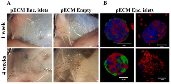 Biocompatibility of the implanted microcapsules. (A) pECM-encapsulated islets and empty pECM microcapsules at the transplantation site, 1 and 4 weeks following transplantation. (B) pECM-encapsulated islets 1 week and 4 weeks following transplantation, immunostained for insulin (red) and glucagon (green). Nuclei are stained using DAPI (blue). Scale bars: 50 µm.