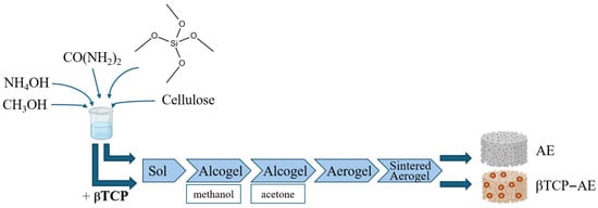 Recent advances in bone tissue engineering have increasingly focused on aerogels as highly promising bioactive ceramic scaffolds due to their ultralight, highly porous, and biomimetic extracellular matrix-like structures. This group includes biocompatible silica-based materials that may contain calcium phosphates, the most prominent bone matrix components at the molecular level, with osteo-inductive features [4,5,6]. These composites, synthesized via sol-gel techniques and supercritical drying, exhibit mesoporous structures with interconnected pores that facilitate nutrient transport and cell infiltration. A general schematic illustration of the multi-step preparation of an aerogel and a β-tricalcium phosphate-containing silica-based aerogel is shown in Figure 1.