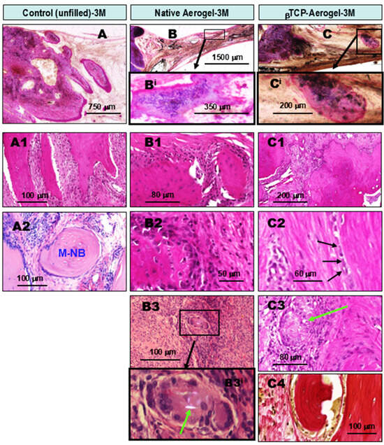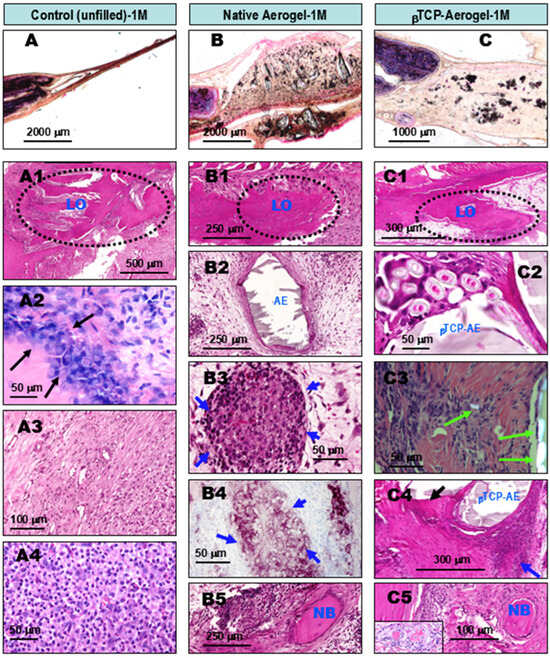 Comparative histopathology of wound healing in rat calvaria bone defects, one month (1M) after operation. The defects were either left untreated (control, left column), grafted with silica aerogel (AE, middle column), or filled with βTCP-aerogel (βTCP-AE, right column). The upper panel images (A–C) show hematoxylin–eosin (HE)-stained ground sections of resin-embedded native, non-decalcified specimens, providing a view of one of the bone defect’s edges (the black discolorations are deposited artifacts from the polishing procedure). All other images show HE-stained and decalcified tissue samples. As shown in the representative images of the untreated control specimen (A1–A4), the lateral edge of the bone defect exhibited reparative ossification with a budding pattern (A1, LO), accompanied by osteoblast proliferation (A2, arrows). The rest of the bone defect exhibited fibrous granulation tissue with the presence of leukocytes (A3,A4). In contrast to the control-comparable LO (B1,C1), the presence of silica components in the aerogels led to the development of chronic fibrous granulomatous inflammation in both the AE- and the βTCP-AE (B2,C2) treated bone defects. As a result, granulomas formed with the presence of epitheloid (activated) cell clusters (B3,C4, blue arrows), which were characteristically immune-positive for CPM (B4, purple cells, blue arrows). Crystalline silica particles were identified in both groups, showing typical birefringence under a polarizing microscope, as marked in (C3) with green arrows. Remarkably and most importantly, both the AE- and βTCP-AE treated bone defects exhibited early intralesional ossifications with new bone formation and osteoid formations inside the defect, independent of lateral ossification (B5,C5, NB). This was preceded by calcification (C4, black arrow). LO, lateral ossification (arising from the edge of the bone defect); AE, silica aerogel; βTCP-AE, β-Tricalcium phosphate silica aerogel; NB, new bone.