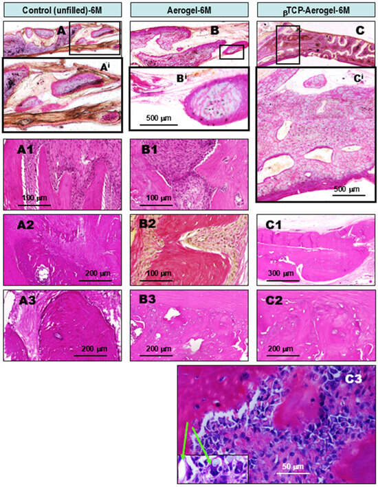 Comparative histopathology of rat calvaria bone defect repair, 6 months (6M) after operation. The defects were left untreated (control, left column) or grafted with silica AE (middle column) or βTCP-AE (right column). The upper pictures (A–C) depict HE-stained ground (frontal) sections for an overview of the lesion, and their framed regions show detailed, magnified images (Ai,Bi,Ci). The untreated bone defects exhibited advanced lateral ossifications within inflammatory, dense, fibrous, and scarred solidified tissues (A1, left, and bottom pink spikes protruding upward), along with intralesional calcifications (A2) and ossification (A3), which were morphologically reminiscent of dystrophic calcification–ossification (A2,A3). In addition to the control-comparable lateral ossification in both the silica AE- and βTCP-AE-treated bone defects, large amounts of coalescent, newly formed compact bone tissue was observed inside the bone defects (B3,C1,C2). As shown in (B1,B2) (van Gieson-stained) sections, between the newly formed and maturing bones (B1, left and right pink area; B2, central yellowish-red lamellated hourglass-shaped parts), small foci of ongoing low-grade chronic fibrous inflammation were present, with accumulated collagen bundles (B2, at left and right red fibers). These areas were partly associated with the presence of remaining non-metabolized silica crystals from the aerogel, detected under a polarizing microscope (C3, insert, green arrows). Apart from (B2), all images depict HE-stained sections.