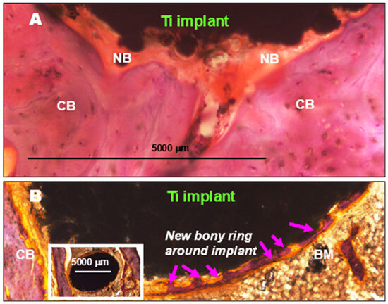 Contrary to this morphologic pattern, titanium implants without a surface coating do not lead to granulomatous inflammation during the process of osseointegration. On the other hand, based on our archived tissue sections, a complete callus-like ossifying ring around implants readily developed in a much shorter time, i.e., by the 3rd month, in dogs’ alveolar bones and in sheep’s femur condyle (Figure 7) [25]. The force-activated ossification induced by solid metal implants and the injury-associated reactive inflammatory edema fluid containing mesenchymal cellular remnants (containing surviving stem cells) lead to powerful contact osteo-induction. This promotes tight connection of the bone with the implants for optimal integration, as confirmed by others [26,27,28].