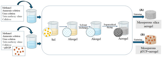 Schematic illustration of the preparation of mesoporous silica aerogel (A) and βTCP-aerogel (B).