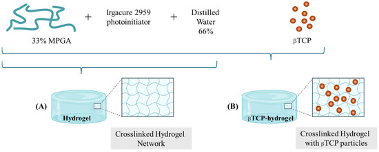 In parallel, hydrogels have emerged as versatile biomaterials that mimic the hydrated extracellular matrix, offering a conducive environment for cell proliferation, differentiation, and nutrient exchange essential for bone regeneration. Injectable hydrogels enable minimally invasive delivery of bioactive molecules, osteogenic growth factors, and stem cells, making them especially suitable for irregular or non-load-bearing bone defects [11]. Recent developments in nanocomposite hydrogels, such as those incorporating guanidinylated hyaluronic acid and silica-rich nanoclays, have demonstrated self-healing properties and enhanced osteogenic capacity by effectively delivering demineralized bone matrix particles in vivo [12]. The tunable mechanical properties and dynamic crosslinking of these hydrogels facilitate sustained bioactivity and integration with host tissue, addressing challenges related to particle dispersion and osteo-inductivity. The simplified preparation scheme of a methacrylated poly-γ-glutamic acid (MPGA)-based hydrogel (HG) [13] and its composite version containing βTCP (βTCP-HG) is shown in Figure 2.
