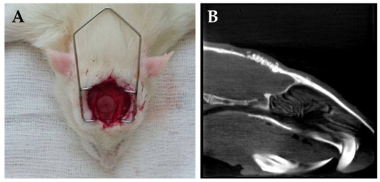 All operations were carried out under sterile conditions. The rats were anesthetized through intraperitoneal injection of ketamine (CP-Ketamin 10%, Prod-ulab Pharma B.V., Raamsdonksveer, Holland), in combination with xylazine (Xylazin 2%, CP-Pharma, Burgdorf, Germany) at a 2:1 ratio (0.5–0.55 mL per animal) [15]. To evaluate bone regeneration, the “rat critical size calvaria defect” model was used according to the instructions for the step-by-step surgical procedures, published in Nature Protocols by Spicer P.P. et al. [29], and as described in our previous paper [15]. Briefly, after shaving the dorsal part of the cranium, a sagittal aseptic midline incision was made, running through the skin, the underlying muscle, and the periosteum, to reach the calvarium. This was followed by a gentle preparation of the periosteal membrane from the parietal bone. Using an 8 mm diameter sterile dental trephine bur, the bone was exposed in the midline of the parietal region and gradually cut and thinned at a low speed. The full thickness of the bone was then removed up to the dura, which was left intact to prevent any brain injury. The bone defect was then cleaned with intense saline irrigation. After inserting the various types of biomaterials (Figure 10) (or leaving the site empty for controls), the periosteum and the overlying skin were then closed in two layers with resorbable sutures. To prevent postoperative infections, the animals received antibiotics for 5 days, as previously described [15]. After an uneventful postoperative period, at the indicated times (1st month, 3rd month, and 6th month), the animals were sacrificed with an ip injection of an overdose of anesthetics. Then, the calvaria bone with the defect was removed for histopathological analyses.