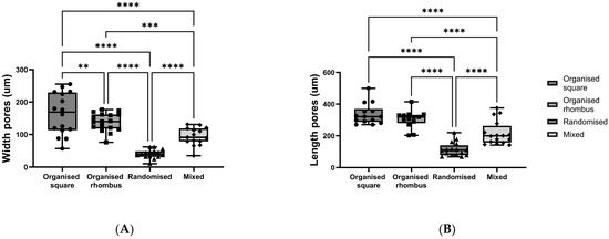 n = 3). The measurements of the pores were taken in two directions: length (L) (defined as the most extensive distance) and width (W), defined as the shorter distance, were plotted and analysed separately. All the pictures analysed were brightfield, taken with an inverted microscope (EVOS, ThermoFisher Scientific, Breda, The Netherlands), with 10× objective magnification. While we generated 2D images of a 3D object to assess pore sizes, only the distance between the fibres in the same 2D plane was determined (in µm).