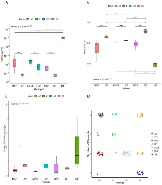 Figure 2A), yielding the time to 50% relaxation (s) and relative importance (%) of the contributing number of Maxwell elements. The relevance of the contribution was determined if the Maxwell element did not decrease the chi-square value by 3% compared to the previous element [