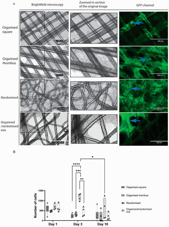 Figure 4A). Yet, organised square meshes appeared to reduce the formation of fibroblast sheets. The randomised and organised/randomised meshes (compared to organised square design (