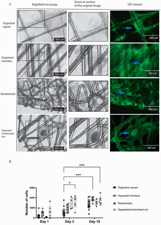 Figure 3A). In meshes with an organised square architecture, endothelial cells adhered to the fibres but barely spread out to form sheets and cover the pores. In contrast, in the case of the organised rhombus and randomised MEW meshes, the inter-fibre gaps were closed by endothelial sheets after ten days. Cell sheets were formed heterogeneously on organised/randomised meshes. The number of cells was higher in the randomised mesh group compared with two of the other three mesh designs on day three of culture (organised square