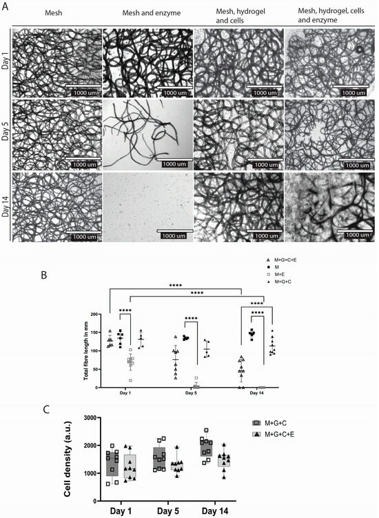 Figure 5A). In the enzyme and mesh group, compared to the control (no enzyme), total fibre length decreased within one day (