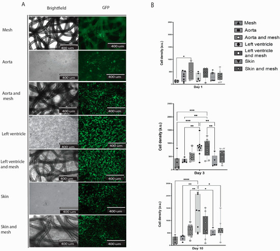 Figure 6B). At day 10, the control group of a mesh and cells showed the lowest cell count of all groups (mean 220.4 ± 150 SD); only the LV hydrogel showed a statistically significant increase in cell number compared to mesh alone (