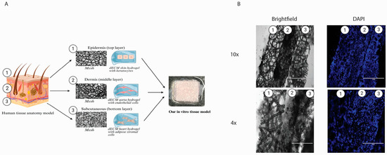 Figure 7B). The top layer, representing the epidermis, was designed with a denser mesh and smaller pores to prevent the keratocytes from possibly migrating to other layers. Together with dECM, skin hydrogel represents the outer tissue barrier and keratocytes isolated from the skin, specifically the epidermis. For the middle layer, representing the dermis, we used dECM aorta hydrogel, rich in elastin, with a mesh and endothelial cells, representing small blood vessels. The bottom layer represented the subcutaneous layer, made from dECM LV hydrogel, as it had the highest stiffness, supporting the whole construct, together with a mesh and iASCs isolated from fat tissue.