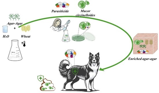 Edible agar–agar provides a medium gel for the parasitophagous fungus M. circinelloides, which can develop properly and produce high amounts of spores; these biological properties are not affected by the presence of piperazine or levamisole; these are anthelmintics routinely administered to pets and farm animals. Accordingly, agar–agar biopolymers represent promising strategies for the control of helminths, with the aim of curing animals (anthelmintics) and preventing new infections by minimizing soil contamination (parasitophagous fungus). New investigations are being carried out into the rheological characterization of this novel formulation, including testing among pets and livestock.