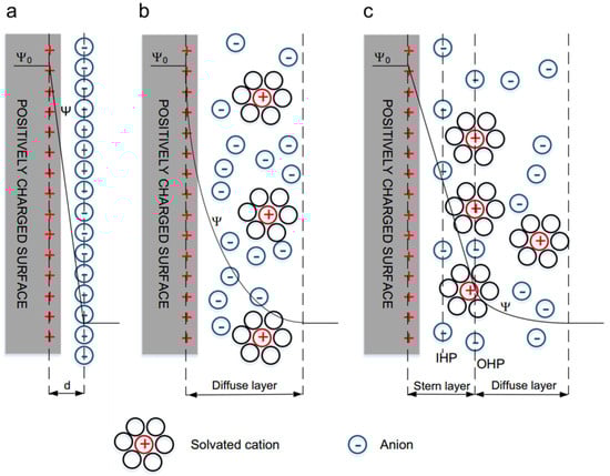 EDL models: (a) Helmholtz model, (b) Gouy–Chapman model, and (c) Stern model. Reprinted with permission from [1].