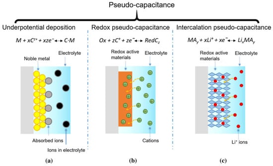 Schematics of charge storage in pseudo-capacitors: (a) underpotential deposition, (b) redox reactions, (c) ion insertion/extraction. Reprinted with permission from [4].