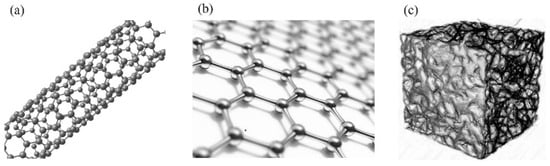 Physical models of common carbon-based materials: (a) one-dimensional carbon nanotubes; (b) two-dimensional graphene; (c) three-dimensional carbon aerogel.
