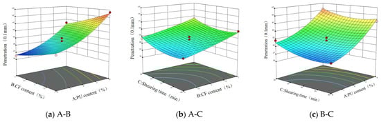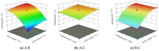 According to the data in Table 1, multiple regression analysis was carried out, and A (polyurethane prepolymer content), B (ceramic fiber), and C (shear time) were used as response surface variables. The response surface models of penetration, softening point, and ductility were established by using the software Design-Expert 13 and were expressed as (1)~(3), respectively. The response surface diagrams of the influencing factors affecting the response value are shown in Figure 1, Figure 2, Figure 3 and Figure 4.