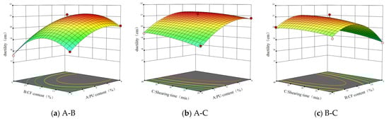 Based on the steepness of the surface in Figure 3a, the influence of factor B on the change in asphalt ductility is more significant than that of factor A, which indicates that the change in ceramic fiber content is more sensitive to the change in ductility. As can been seen by the similar trend of the two factors in relation to ductility change, it is speculated that there is a certain interaction between factor A and factor B. It can be seen from Figure 3b that the change in factor A has a more significant effect on the steepness of the surface, indicating that the polyurethane prepolymer content has a greater influence on the ductility of the asphalt. With the increase in the PUP content, the ductility of the asphalt increases first and then decreases. It can be seen from Figure 3c that there is an interaction effect of ceramic fiber content and shear time on the ductility of the response value. With the change in B, the surface is more steep, indicating that the influence of ceramic fiber content on asphalt ductility is more significant than that of shear time. When the shear time is constant, with the increase in ceramic fiber content, the ductility increases first and then decreases.