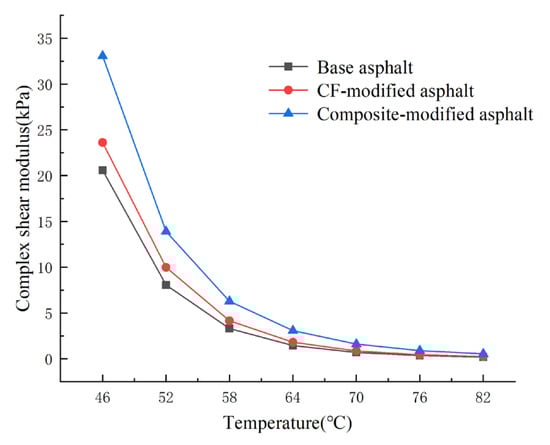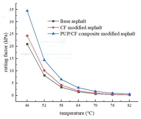 It can be seen from Figure 6 that the rutting factor decreases significantly with the increase of temperature, and the rutting factor of PUP/CF composite modified asphalt is the largest, followed by CF modified asphalt, and the matrix asphalt is the smallest. However, as the temperature rises to a certain extent, the gap between the three rutting factors gradually narrows. This is due to the transition of asphalt from an elastic state to a viscous state at high temperature. The viscous component increases, the elastic component decreases, and the asphalt is more likely to deform, so the rutting factor will decrease. At 46 °C, the maximum rutting factor of PUP/CF composite-modified asphalt is 34.50 kPa, which is 10.17 kPa larger than that of CF-modified asphalt and 13.57 kPa larger than that of matrix asphalt, indicating that CF plays a role of filling and supporting asphalt to prevent excessive deformation at high temperature. PUP can fill the gap between fibers, and its internal structure is more stable; so, the resistance to deformation of asphalt is improved, and the rutting factor increases.