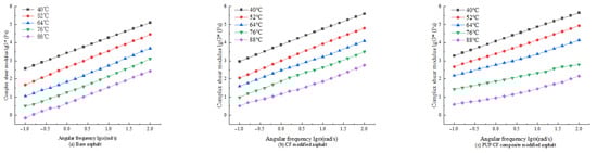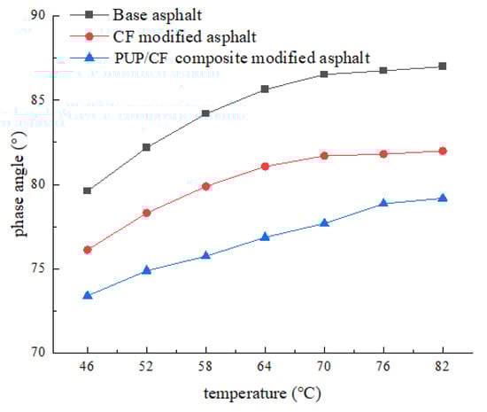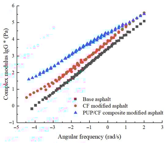 It can be seen from Figure 7 that the complex shear modulus of different asphalts increases with the increase in angular frequency at the same temperature, and the two show an approximate linear correlation. This is because when the angular frequency increases, the load action time is shortened, the elastic characteristics of the asphalt are highlighted, and the elastic deformation increases, making the complex shear modulus increase. The higher angular frequency corresponds to the high speed of the vehicle, and the complex shear modulus is the ability of the asphalt to resist deformation. Under the same temperature and the same frequency, the complex shear modulus of PUP/CF composite-modified asphalt is the largest, and the matrix asphalt is the smallest. This shows that the addition of PUP increases the elastic properties of asphalt, and CF increases the stiffness of asphalt. The combination of the two makes the asphalt show better anti-deformation ability.