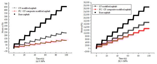 The test results are shown in Figure 9. Under a creep cycle of 0.1 and 3.2 kPa stress levels, the strain is gradually increasing. It can be seen from Figure 9a,b that the strain level of the matrix asphalt in a cycle period shows almost no recovery ability, indicating that the matrix asphalt has relatively weak resistance to deformation when subjected to stress. It can be seen from Figure 9a,b that under the same stress level, the cumulative strain of PUP/CF composite-modified asphalt is lower than that of CF-modified asphalt. At 0.1 kPa, both asphalts have good recovery ability, but at 3.2 kPa, the recovery strain ability of the two modified asphalts becomes weaker; compared with the matrix asphalt, the cumulative strain is greatly reduced, indicating that PUP and CF can give asphalt better resistance to deformation and effectively inhibit strain accumulation under stress. All tests were performed in triplicate, and the results are reported as the mean ± standard deviation. One-way ANOVA (α = 0.05) was used to assess the significance of differences between modified and unmodified asphalt.