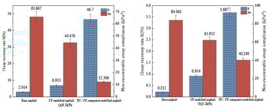 It can be seen from Figure 10 that under the stress of 0.1 kPa, the R value of matrix asphalt is the smallest, and the R value of CF-modified asphalt is not significantly higher than that of matrix asphalt, which is only increased by 3.999%. The R value of PUP/CF composite-modified asphalt is the largest, which is 43.786% higher than that of matrix asphalt. It shows that the addition of CF has no obvious effect on the strain recovery of asphalt. The chemical structure and physical properties of PUP enhance the elastic composition of CF-modified asphalt, improve the flexibility and elasticity of composite modified asphalt, and enhance the resistance to deformation of asphalt. It can be seen from (b) that compared with the stress of 0.1 kPa, the R of the three asphalts at the stress level of 3.2 kPa is greatly reduced. Under the action of large stress, their recovery deformation ability is weakened, but PUP/CF composite-modified asphalt have a relatively higher performance than CF-modified asphalt and matrix asphalt. The performance is the best, indicating that the addition of PUP and CF improves the creep recovery ability of asphalt, but under large stress, the improvement effect is weakened.