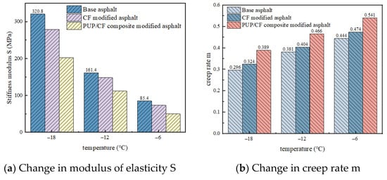 BBR evaluates the low-temperature rheological properties of asphalt by measuring the bending deformation of the beam sample at a certain temperature. The basic principle is that the asphalt sample is prepared into a long strip, and then a constant load is applied in the test. The low-temperature performance of the asphalt is judged by measuring the deformation of the beam in a certain period of time. In the test, PUP/CF composite-modified asphalt was tested at −6 °C, −12 °C, and −18 °C, and the stiffness modulus S and creep rate m were measured.