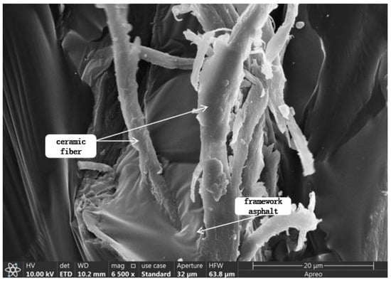 Ceramic fiber, a fibrous material made of ceramic materials, is characterized by its light weight, high strength, high temperature resistance, low thermal conductivity, good chemical stability, and excellent thermal insulation performance [,]. It has gradually attracted attention in the asphalt field: its low thermal conductivity can reduce heat accumulation in asphalt pavements, delay asphalt softening, and reduce the risk of high-temperature rutting; its chemical stability can slow down asphalt aging and extend pavement service life. WAN Jiuming et al. [] used DSR to confirm that ceramic fibers can significantly enhance the high-temperature performance of asphalt, and scanning electron microscopy (SEM) and atomic force microscopy (AFM) observations showed that ceramic fibers have good dispersibility in asphalt. Arabani M, Shabani A et al. [,] found that adding ceramic fibers to asphalt can improve its high-temperature performance, but its low-temperature performance decreases slightly; additionally, ceramic fibers can enhance the permanent deformation resistance and fatigue life of asphalt mixtures, with a recommended dosage of 3%. Zhou Haicheng et al. [,] found that the addition of ceramic fibers significantly enhances the high-temperature performance of asphalt mixtures but also causes a slight reduction in low-temperature performance. Xiao Ziwei [] found that nano-AAT/ceramic fiber composite-modified asphalt, although with slightly weakened low-temperature performance, has excellent high-temperature deformation resistance and shows significant advantages in pavement performance, including high-temperature stability, low-temperature crack resistance, and water stability.